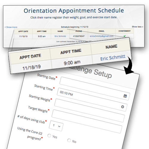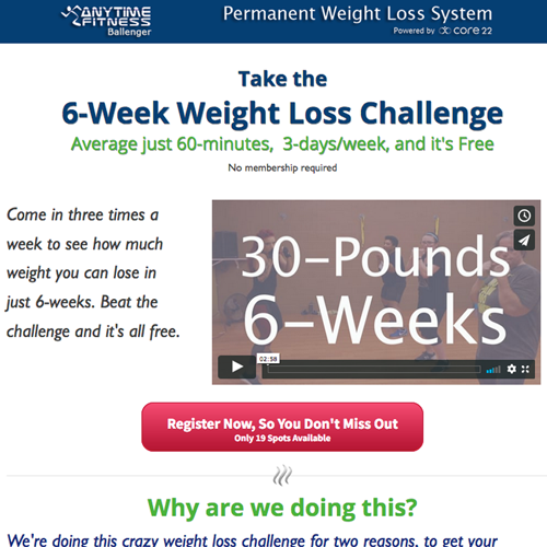 We provide a link for your ads that open a landing page with stories about the effectiveness of your weight loss program. Each story includes a hyperlink that opens a second landing page about your weight loss challenge. The challenge allows anyone interested in losing weight to pay a discounted fee to try your program for one of six challenge periods lasting between 21-days and 12-weeks. Challengers are entitled to three group training sessions a week, Core-22 with one-month of supplements, and use of the club as a member.