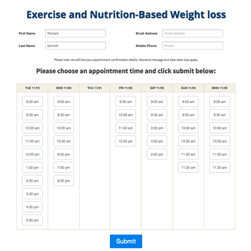 The goal of the landing page is to schedule a 30-45 minute orientation appointment. When someone clicks the Register Now button from the landing page, it opens a form where they choose one of the available dates and times.
