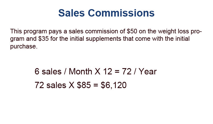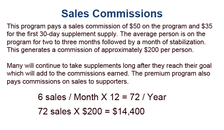 Commissions based on the sale of the program and a 30-day supplement supply